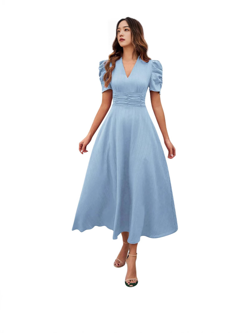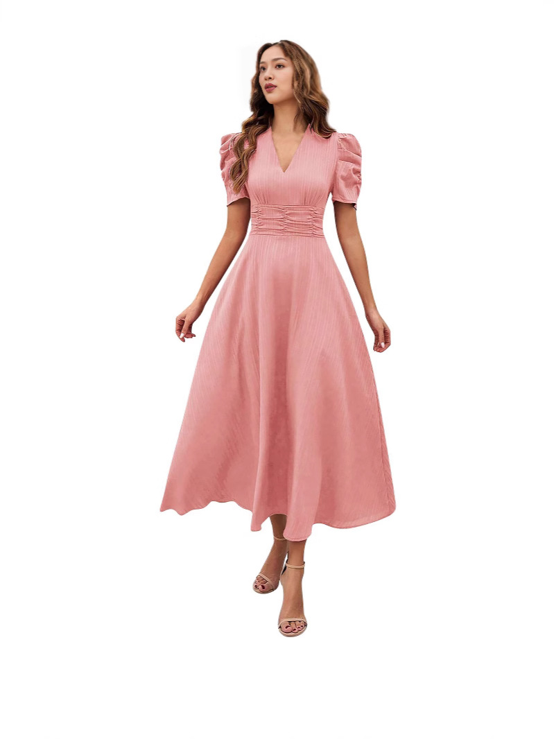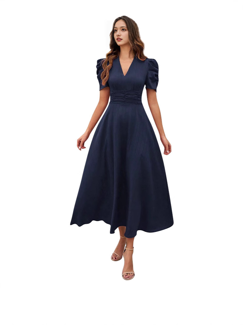 2026跨境春夏亚马逊女士时尚气质高腰纯色收腰短袖连衣裙