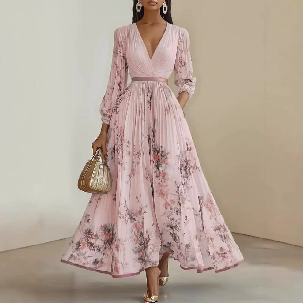 欧美2026秋冬外贸新款女装印花v领长袖时尚压褶连衣裙长裙女