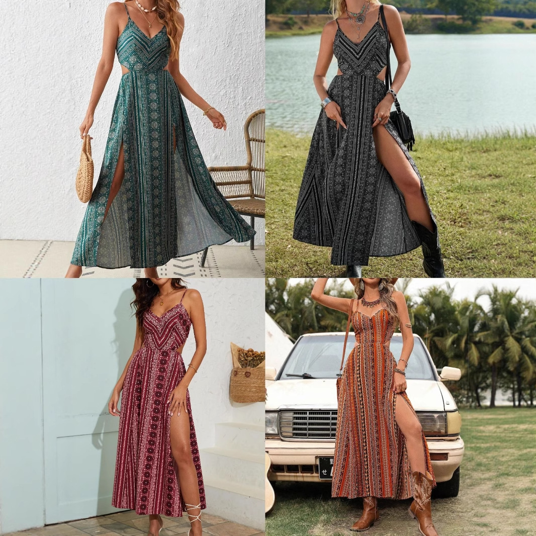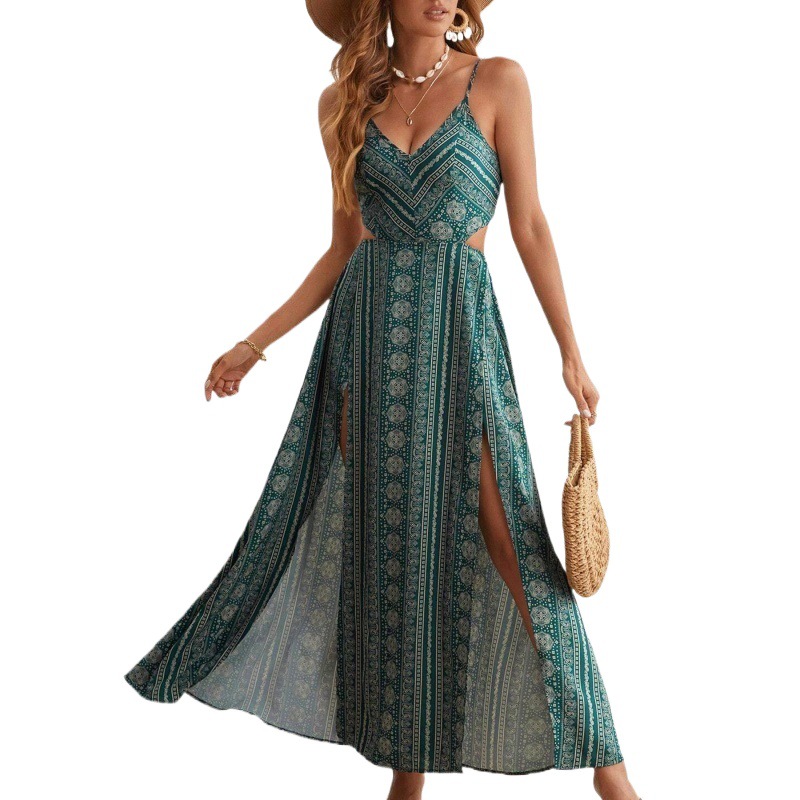 新款春夏欧美跨境时尚印花性感露背吊带开叉度假风连衣裙