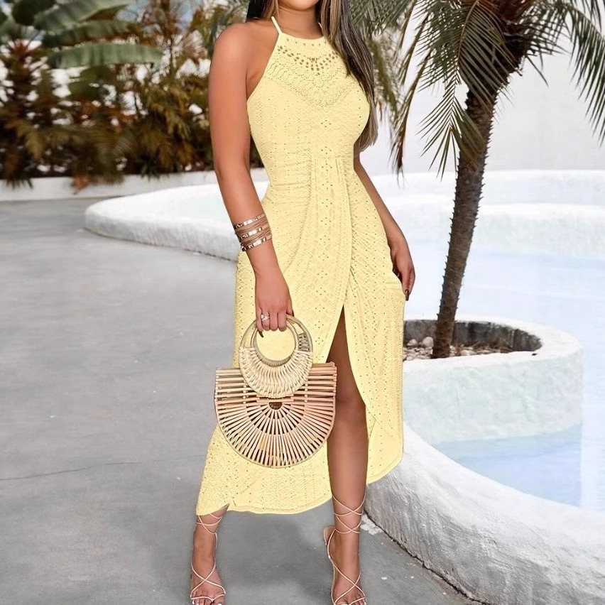 Solid color sleeveless slit dress 女士纯色圆领无袖开叉连衣裙